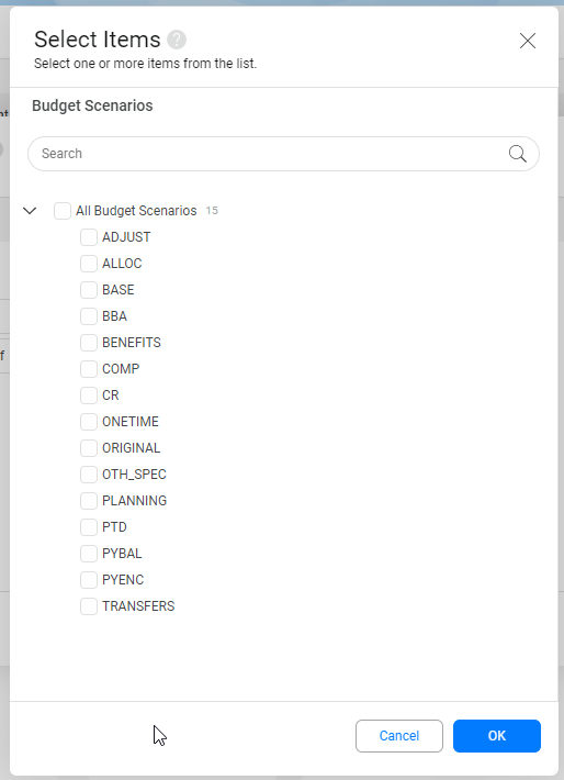16.The various budget scenarios we use will appear. You can select the scenarios to just view the base budget for your unit, or the scenarios to view the base and revised budgets (see following steps).