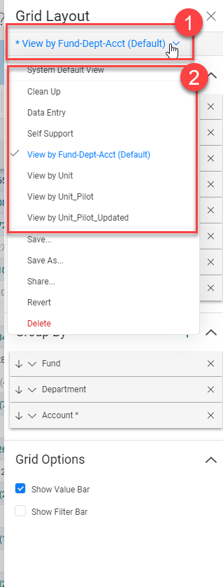 24.To view saved layouts, select the top dropdown (1). You should have a saved layout that the Budget Office has shared with you titled “View by Fund-Dept-Acct”(2).